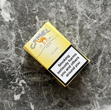 - Appearance: Yellow and silver pack with camel logo, brown accents, cork-colored tipping paper.